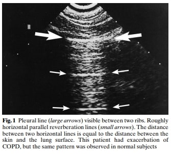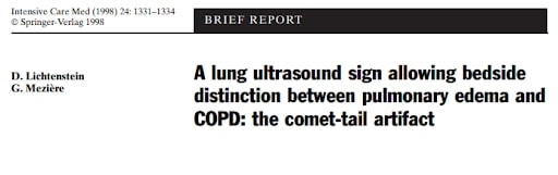 A significant portion of our current knowledge in lung ultrasound stems from Dr. Daniel Lichtenstein’s landmark paper in 1998. The paper discussed the use of artifacts to differentiate between pulmonary edema and COPD. Since that time some of the nomenclature was later redefined by Dr. Lichtenstein and what was then described as “roughly horizontal parallel reverberating lines” is now called A-lines and what was then called comet-tail artifact is now referred to as B-lines (defined as stretching below 16cm of depth). Additionally comet-tails artifact is now referred to as Z-lines and are defined distinct from B-lines and have no clinical significance: