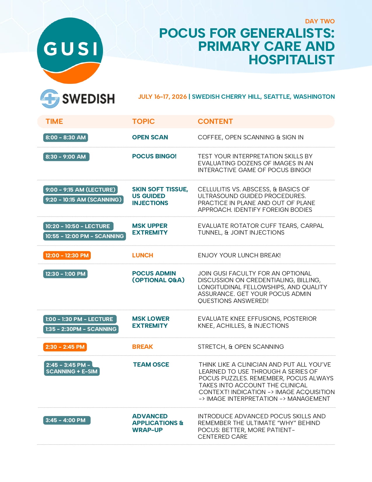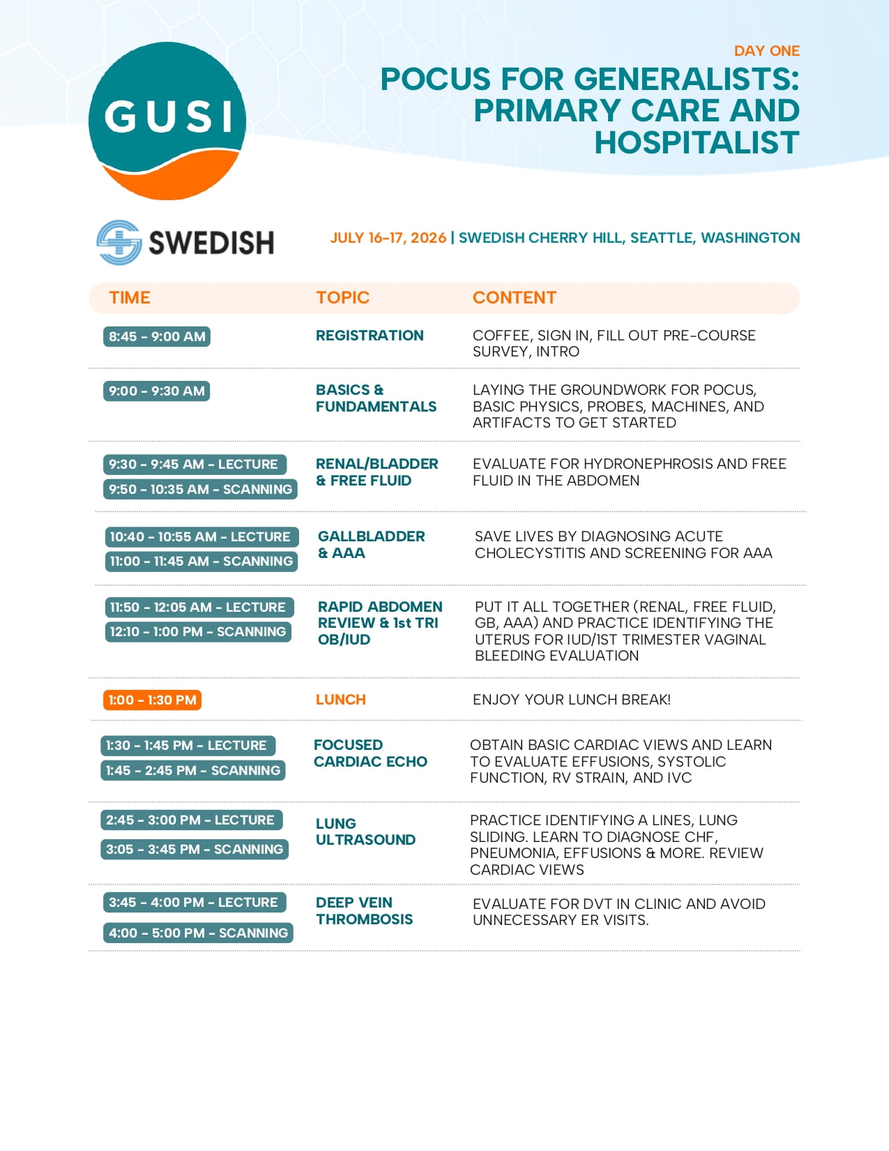 GUSI is partnering with Swedish Health to deliver our acclaimed two-day, in-person Point-of-Care Ultrasound (POCUS) training course, designed for clinicians seeking practical, high-impact ultrasound education.