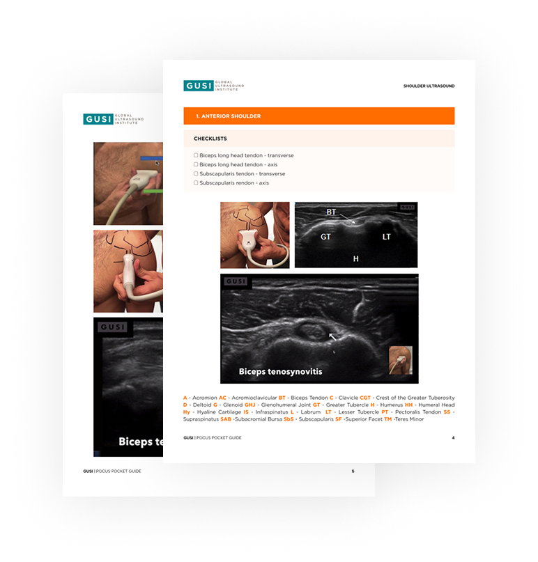 The GUSI Musculoskeletal Essentials POCUS Pocket Guide is a portable, quick-reference tool for musculoskeletal ultrasound, offering essential knowledge for fast, accurate diagnosis of musculoskeletal conditions. Complement your learning with the Musculoskeletal Essentials POCUS Course.